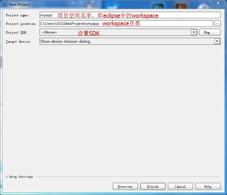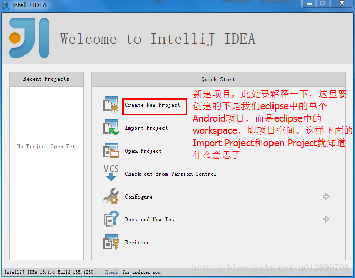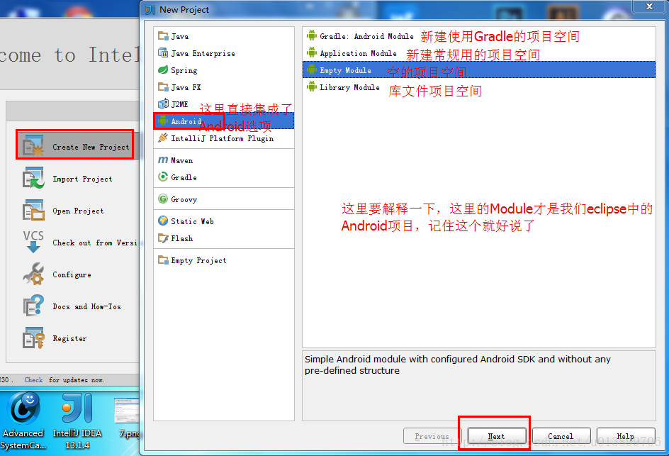 注意:虽然图片中做了介绍,这里还是强调一下,这个软件中的Project不是eclipse中的Android项目,而是eclipse中的工作空间workspace,而该软件中的Module是eclipse中的Android项目,所以新建Project是新建workspace,而新建Module才是新建Android项目