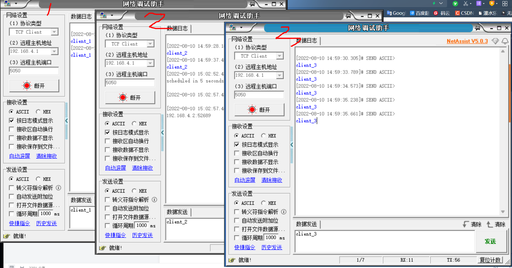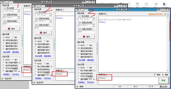 比如我这里通过串口助手给三个客户端各发送一句话,如下:
