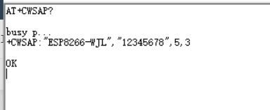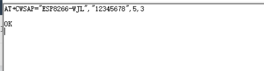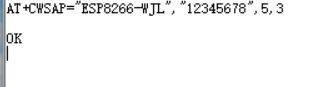 示例:AT+CWSAP="ESP8266-WJL","12345678",5,3