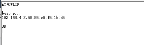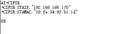 接入热点成功之后,使用AT+CIFSR可以查询到分配给 esp8266 模块的 IP 地址信息,如下: