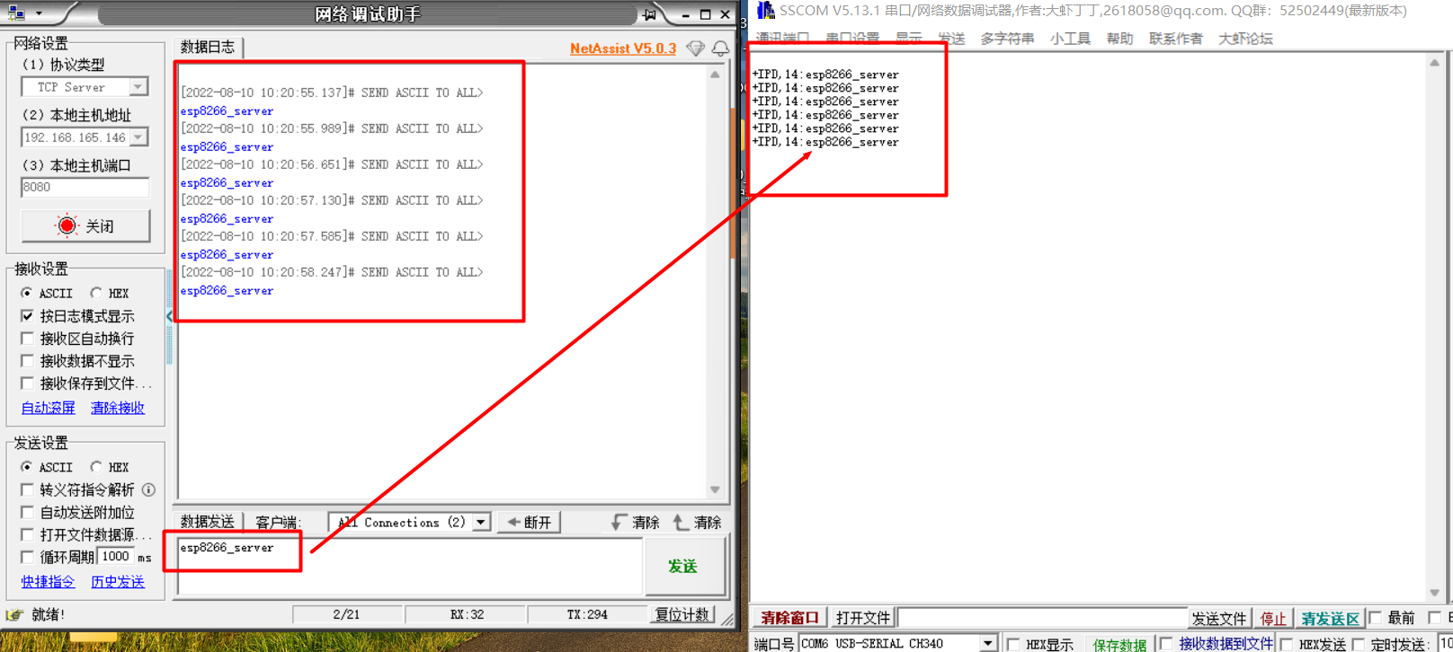(1)服务器(TCP调试助手)发送数据给客户端(ESP8266),直接发送给客户端即可。因为esp8266通过usb线连接到了串口助手,所以服务器发送过来的数据都能在串口助手上看到,如下: