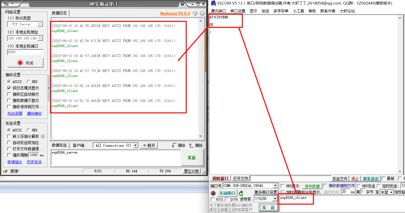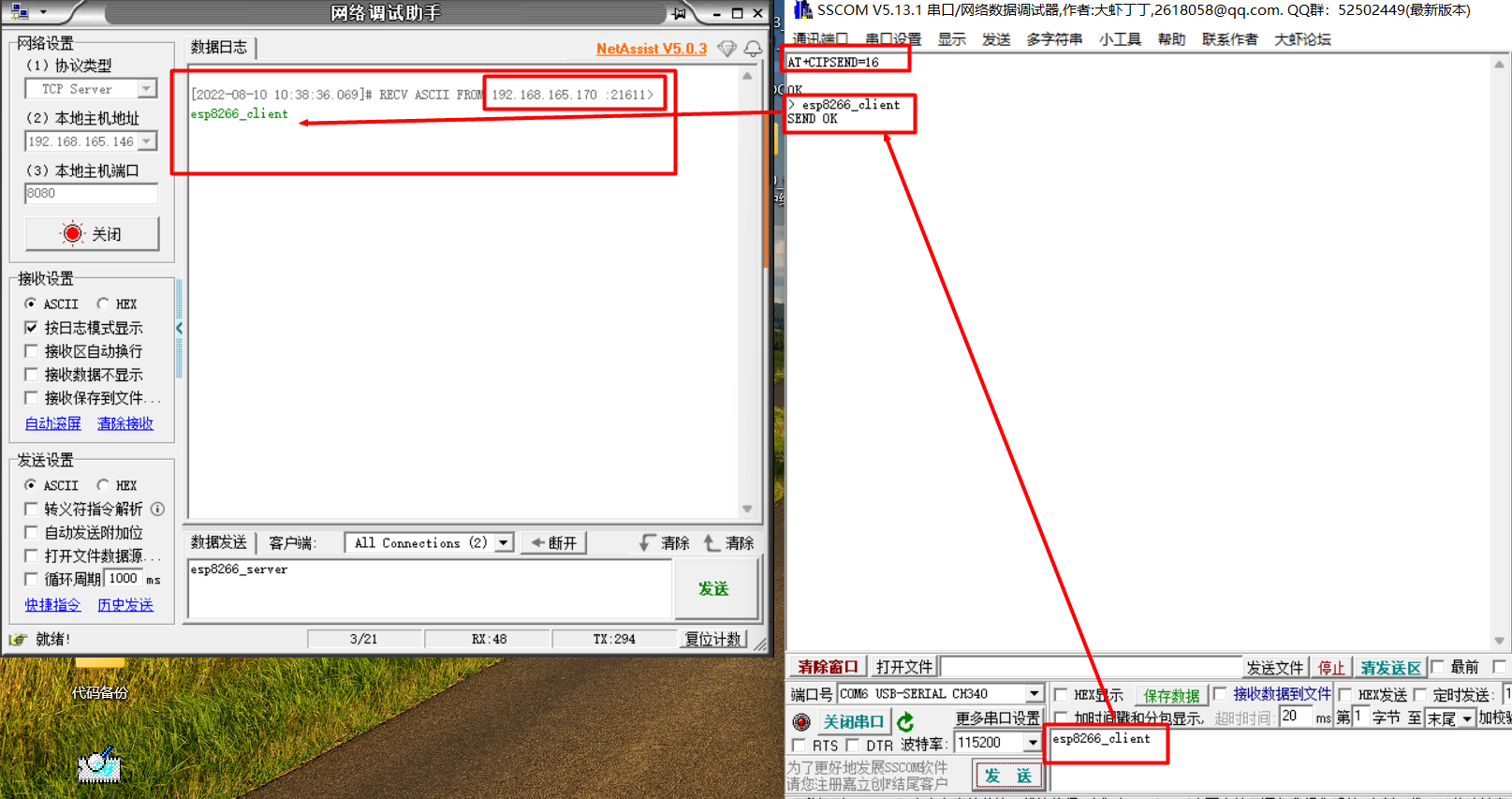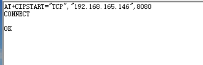(4)建立通信连接。发送 AT+CIPSTART="TCP","192.168.165.146",8080 ,将作为客户端的 ESP8266 连接到 TCP 服务器,IP 地址和端口号都是上一步设置 TCP 服务器时的参数。连接成功之后的示意图如下: