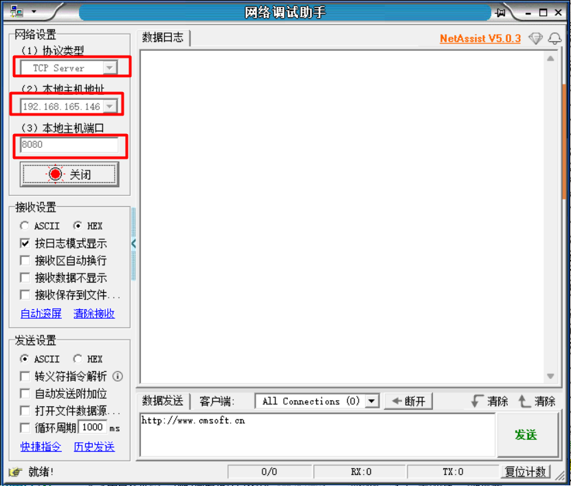 (3)使用TCP调试助手创建一个服务器,用于调试收发,主要是能够直观看到数据的交互。如下所示:
