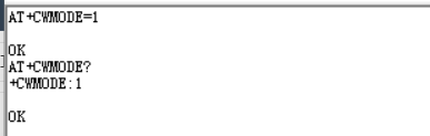 老样子使用 AT+CWMODE?查询模块当前处于哪一种模式,然后我们发送 AT+CWMODE=1,让模块处于Station 模式下。如下所示:
