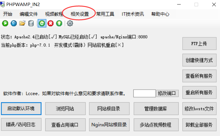 打开PHPWamp软件,依次选择:相关设置>>站点管理>>Apache2.4站点管理