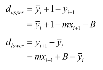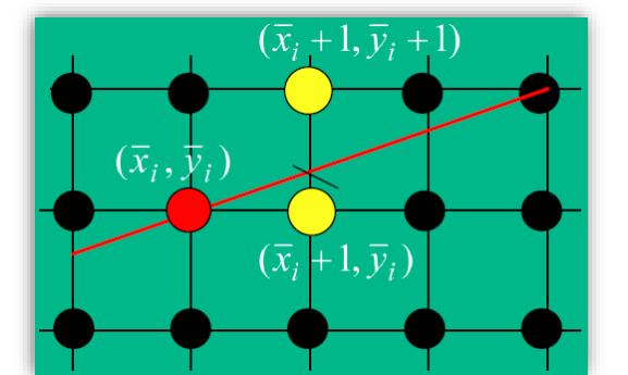 算法的主要思想就是当前一个点确定的时候,这时候下一个点由于一定要在格点地上,所以只会有两种选择,(下图是当斜率小于1且方向为正向的情况),要么是(x+1,y)的点,要么是(x+1,y+1)的点,然后直线上真实的点应该是(x+1, m(x+1)+b),这时候就看这个真实点距离哪个格点比较近就行了。