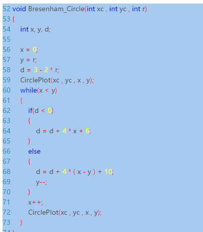 至此好像已经很完美了,但是为了减少使用浮点数运算,我们还要将1.25这个东东变成整数,由于我们只是要看d的符号,一种方法是将d的计算放大两倍,同时将初始值改成3 – 2R,这样避免了浮点运算,乘二运算也可以用移位快速代替,采用3 – 2R为初始值的改进算法,又称为Bresenham算法,有了初值以后就可以像之前那个算法那样一步步迭代了。
