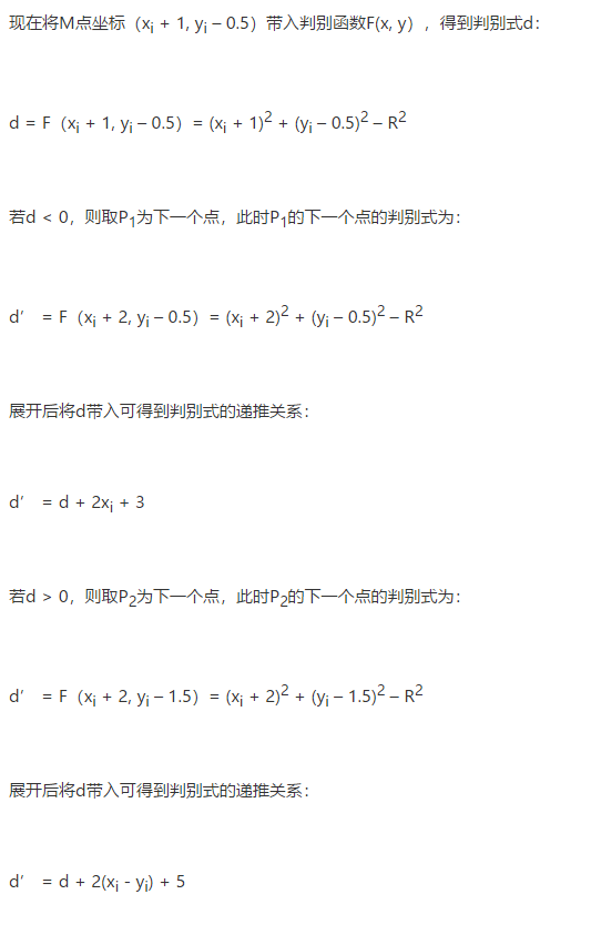 当F(x, y)= 0,表示点在圆上,当F(x, y)> 0,表示点在圆外,当F(x, y)< 0,表示点在圆内。如果M是P1和P2的中点,则M的坐标是(xi + 1, yi – 0.5),当F(xi + 1, yi – 0.5)< 0时,M点在圆内,说明P1点离实际圆弧更近,应该取P1作为圆的下一个点。同理分析,当F(xi + 1, yi – 0.5)> 0时,P2离实际圆弧更近,应取P2作为下一个点。当F(xi + 1, yi – 0.5)= 0时,P1和P2都可以作为圆的下一个点,算法约定取P2作为下一个点。