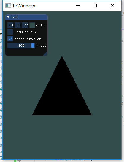 采用这个算法画三角形,就是用三个点分别两两使用上面的算法求出直线上的所有模拟点,然后像上一次作业那样,按照格式x,y,depth,r,g,b放在一个数组里,接着就调用glDrawArrays(GL_POINTS, 0, point_num); 来将这些点全部画出来就行。(这里就略过那些VAO,VBO那些了,和之前是一样的)。