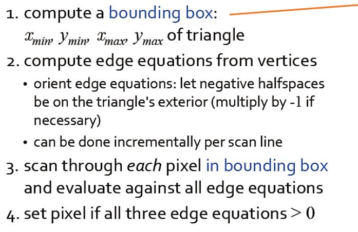 大概的思路就是如下:先通过三个顶点计算出包含三角形的一个矩形,然后扫描矩形里的每一个点,如果他在计算每个直线方程的结果都大于0,即是在三角形里面的。在求直线方程时,仅通过两个点进行计算不能保证里面的点计算是大于0,所以可以通过第三个点进行验证,因为第三个点肯定是在三角形里的,所以就把第三个点带入已计算出的直线方程中,如果大于0就满足,小于0只要把整个直线方程乘以-1,就是把系数乘以-1就行了。