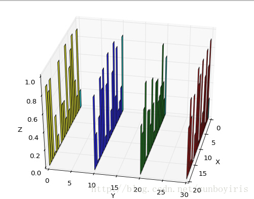ax = fig.add_subplot(111, projection='3d')c为四种颜色 ,z为Z轴的位置