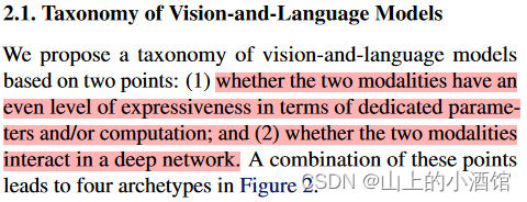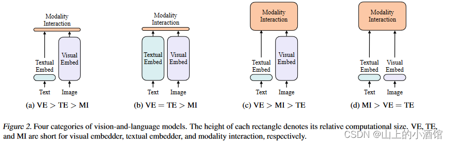 作者根据两点对现在VLP的模型进行了分类,第一点看图像和文本的表达力度是否平衡,表达力度根据参数量和计算量来评价。二者都是很重要的模态,但是现在大多数方法更关注图像特征的抽取。第二点是讲如何将两个模态融合。具体分类如图二。