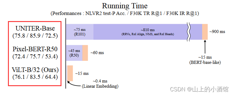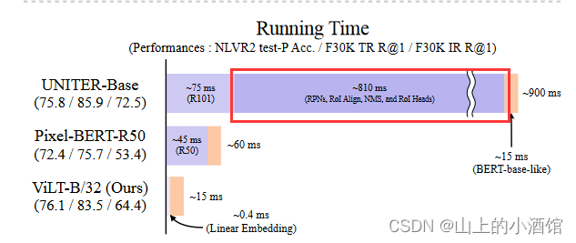 目标检测这就耗费了大量的时候。例如下图UNITER整个运行时间900ms,处理文本只需15ms,大部分时间都用在了处理目标检测任务上,达到了810ms。