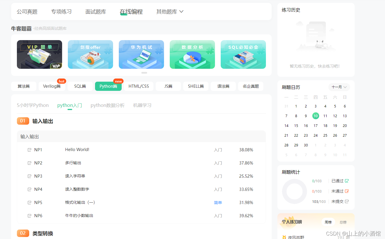 python的学习还是要多以练习为主,想要练习python的同学,推荐可以去看,他们现在的IT题库内容很丰富,属于国内做的很好的了,而且是课程+刷题+面经+求职+讨论区分享,一站式求职学习网站,最最最重要的里面的资源全部免费。