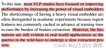 当前,大多是VLP任务主要聚焦在通过改善视觉编码器来提高其性能。然而,现实世界中数据都是每时每秒实时生成的,这时候去做推理的时候,视觉编码器效率低的问题就显露出来了。
