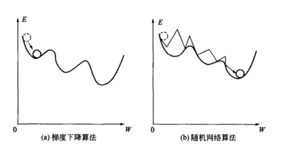 如果将BP算法中的误差函数看作一种能量函数,则BP算法通过不断调整网络参数使其能量函数按梯度单调下降,而反馈网络(Hopfield神经网络)使通过动态演变过程使网络的能量函数沿着梯度单调下降,在这一点上两类网络的指导思想是一致的。正因如此,常常导致网络落人局部极小点而达不到全局最小点,对于BP网,局部极小点意味着训练可能不收敛;对于Hopfield网,则得不到期望的最优解。导致这两类网络陷人局部极小点的原因是,网络的误差函数或能量函数是具有多个极小点的非线性空间,而所用的算法却一味追求网络误差或能量函数的单调下降。也就是说,算法赋子网络的是只会“下山”而不会“爬山”的能力,如果为具有多个局部极小点的系统打一个形象的比喻,设想托盘上有一个凸凹不平的多维能量曲面,若在该曲面上放置一个小球,它在重力作用下.将滚入最邻近的一个低谷(局部最小点)而“不能自拔“但该低谷不一定就是曲面上最低的那个低谷(全局最小点)因此,局部极小问题只能通过改进算法来解决·,本节随机网络可赋予网络既能“下坡”也能“爬山”的本领,因而能有效地克服上述缺陷。机网络与其他神经网络相比有两个主要区别:(1)在学习阶段,随机网络不像其他网络那样基于某种确定性算法调整权值,而是按某种概率分布进行修改。(2)在运行阶段,随机网络不是按某种确定性的网络方程进行状态演变,而是按某种概率分布决定其状态的转移。神经元的净输人不能决定其状态取1还是取0,但能决定其状态取1还是取0的概率。这就是随机神经网络算法的基本概念,下图给出了随机网络算法与梯度下降算法区别的示意图:
