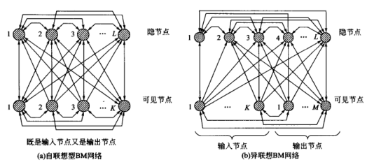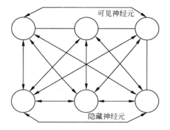 =0。但从神经元的功能上看,BM网络与三层BP网相似,具 有输人节点、隐节点和输节点称为可见节点,而将隐节点称为不可见节点。训练时输人输出节点接收训练集样本,而隐节点主要起辅助作用,用来实现输人与输出之间的联系,使训练集能在可见单元再现。BM网络的三类节点之间没有明显的层次,连接形式可用上图的有向图表示。