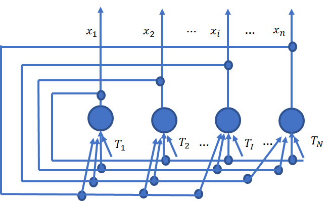 如上图是离散型网络的拓扑结构图,这是单层全反馈网络,共有n个神经元 。任一神经元的输出均通过连接权接收所有神经元输出的反馈回来的信息,其目的就在于任何一个神经元都受到所有神经元输出的控制,从而使各神经元的输出相互制约,每个神经元均设有一个阈值