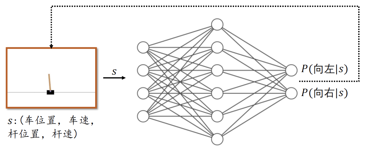 πθ网络代表了智能体的策略,称为策略网络。很自然地,我们可以将策略函数具体化为输入节点为4个,中间多个全连接隐藏层,输出层的输出节点数为2的神经网络,代表了这两个动作的概率分布。在交互时,选择概率最大的动作