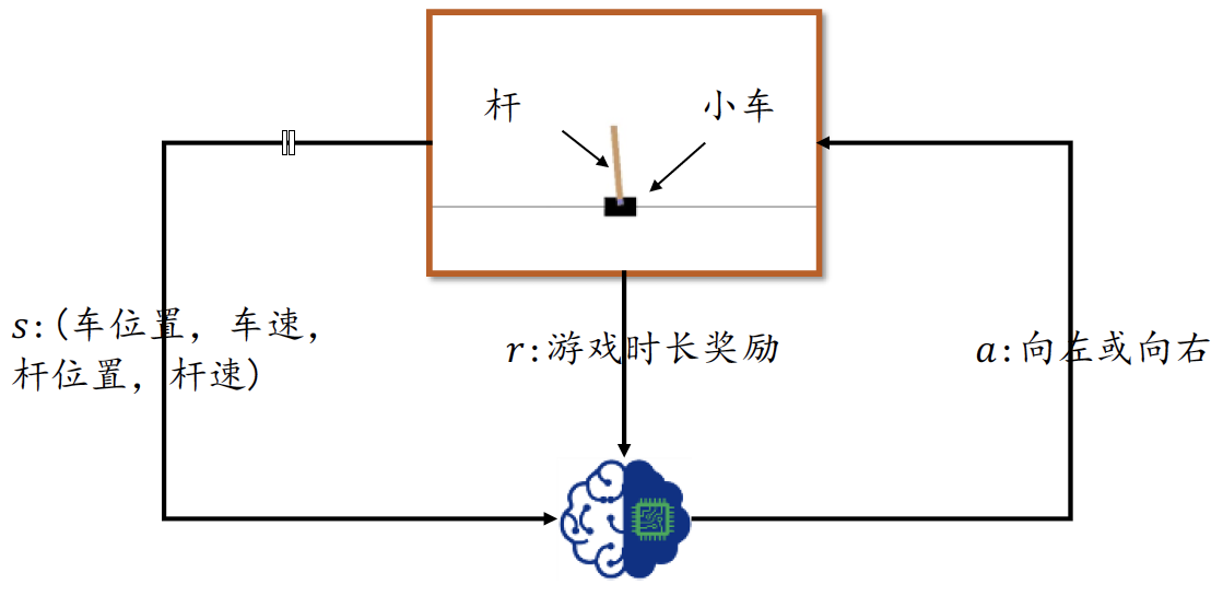 a为向左移动或者向右移动,动作施加在平衡杆系统上会产生一个新的状态,同时系统也会返回一个奖励值,这个奖励值可以简单的记为1,即时长加1。在每个时间戳