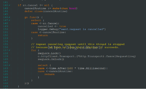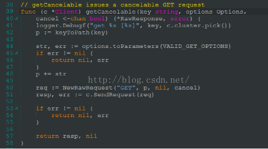 在下面我们看到这里当RawRequest中的Cancel不为nil的时候,会启动一个协程来接收cancel消息。 但目前我们分析的Get是没有设置的