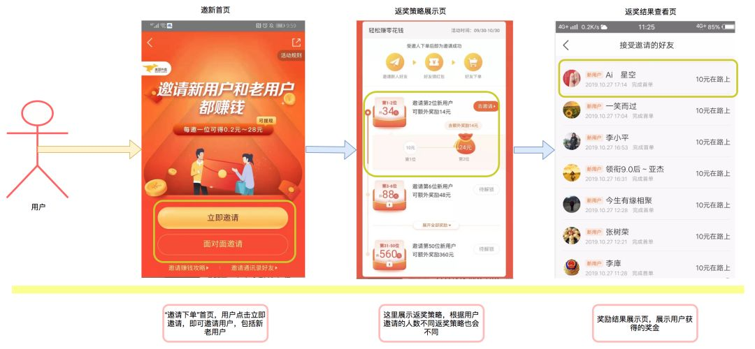 根据老用户的用户属性来计算返奖金额。为了评估不同的邀新效果,老用户返奖会存在多种返奖机制。