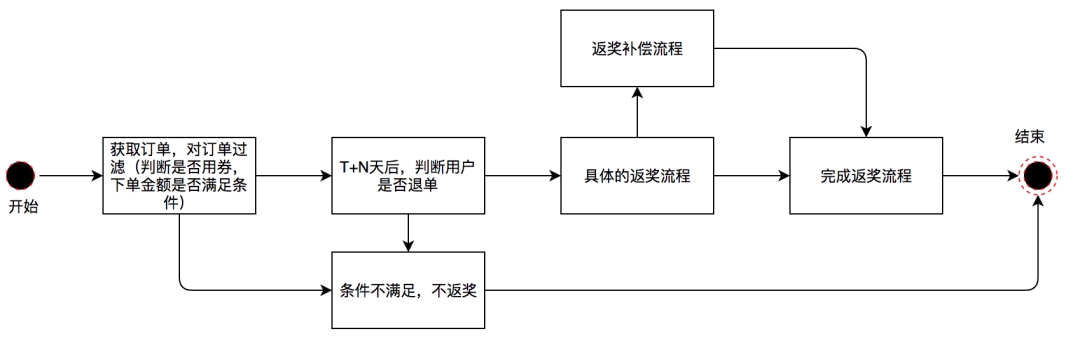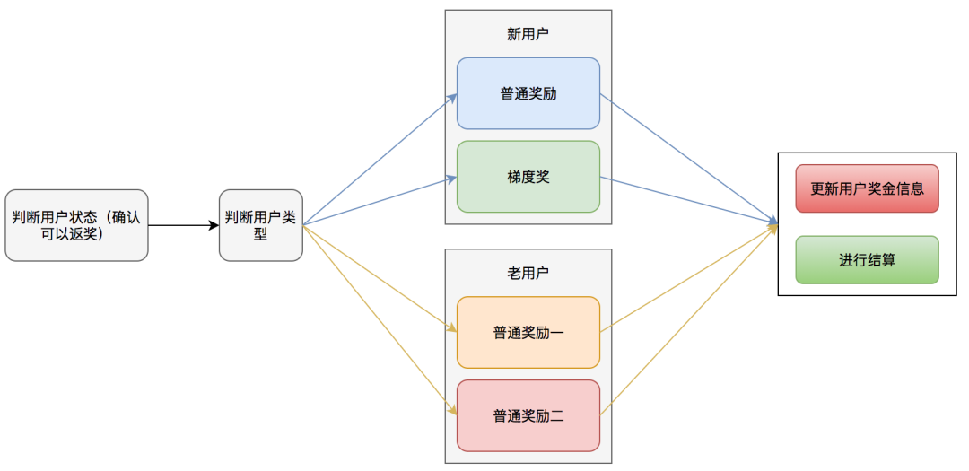 从这份业务逻辑图中可以看到返奖金额计算的规则。首先要根据用户状态确定用户是否满足返奖条件。如果满足返奖条件,则继续判断当前用户属于新用户还是老用户,从而给予不同的奖励方案。一共涉及以下几种不同的奖励方案: