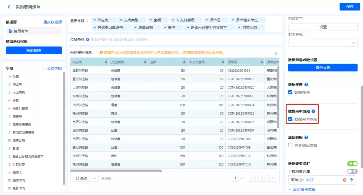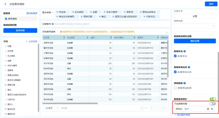 1)新增【费用清单】报表,用基础报表【数据表】展示数据源为表单【费用清单】的数据;