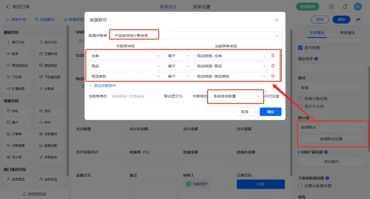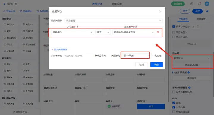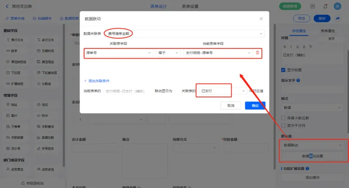 4)【支付明细.已支付(辅助)】字段设置默认为数据联动,添加联动条件及设置关联字段;