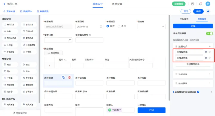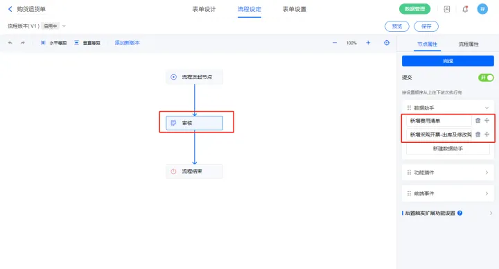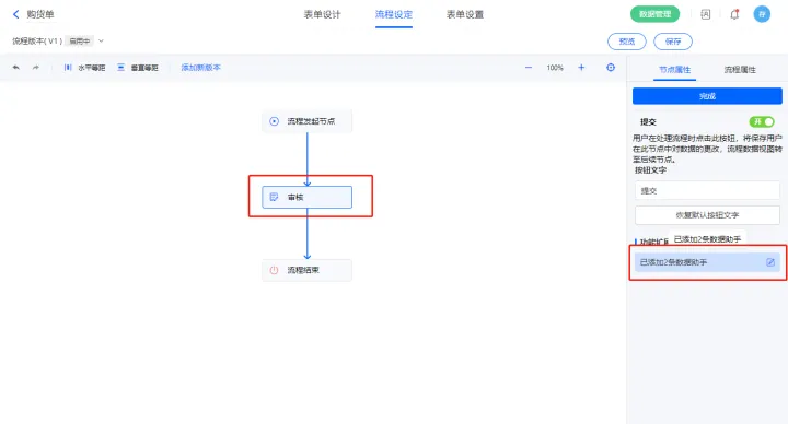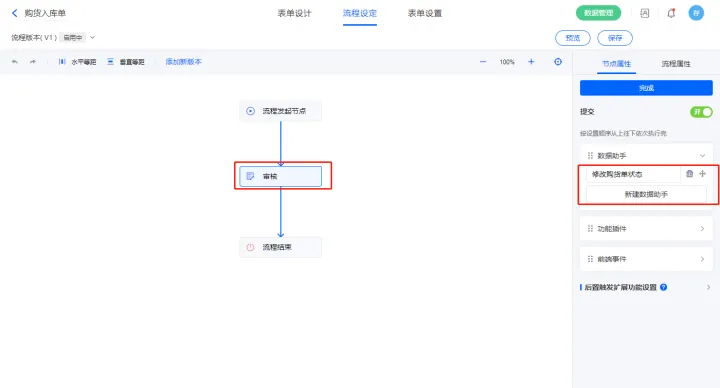 3)该表单是流程表单,设置流程节点审核,该节点属性的节点权限提交设置一条数据助手,名称为修改购货单状态;