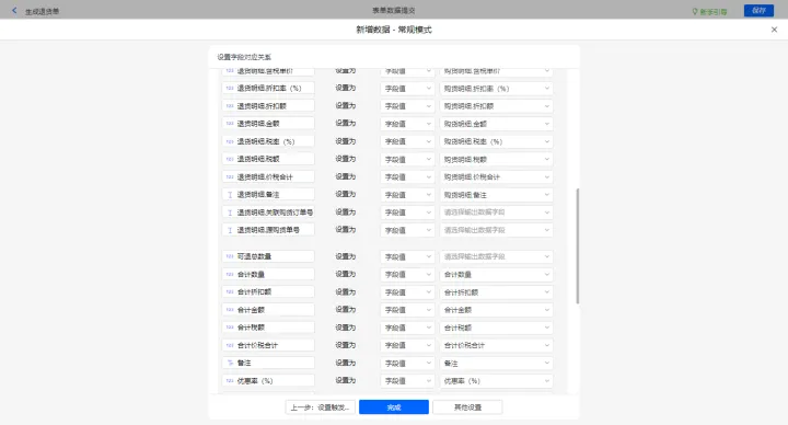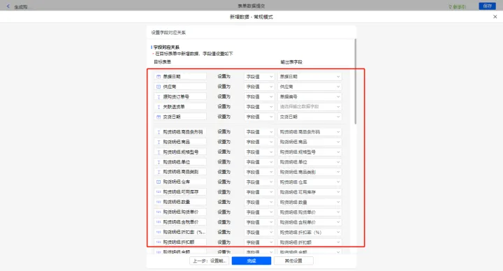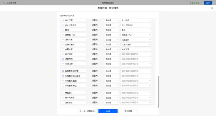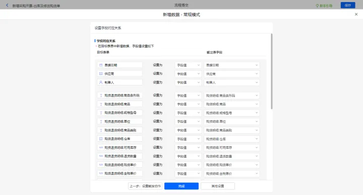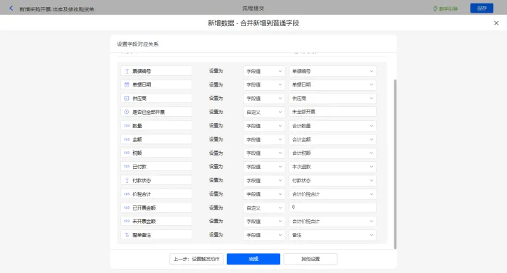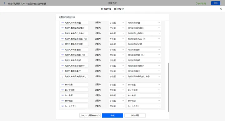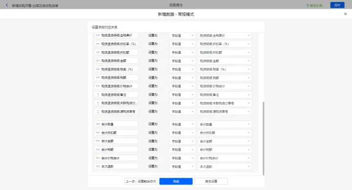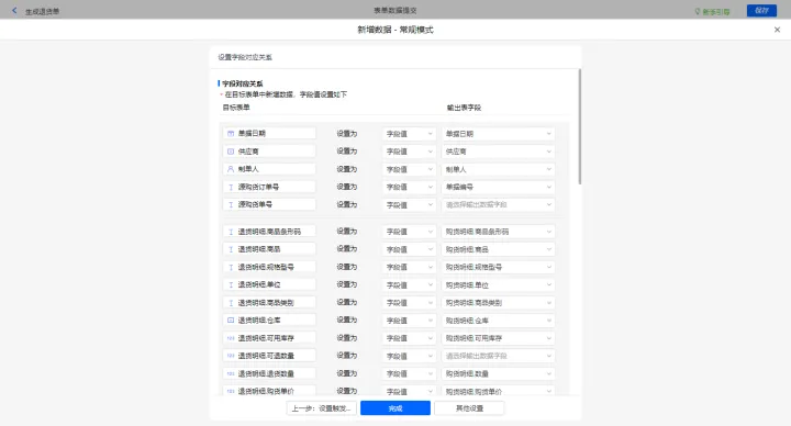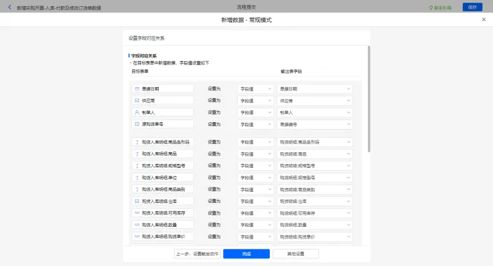 新增采购开票-出库及修改购货单的数据助手,有三个执行动;新增新增数据的执行动作,选择目标表单【采购开票】,选择对应字段,设置好点击【完成】并保存该数据助手;