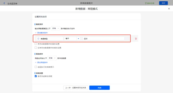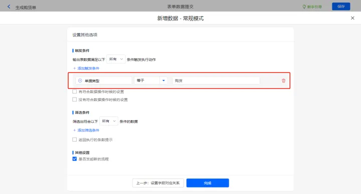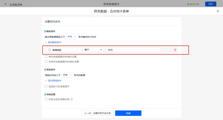 其他设置触发条件为【源购货单号】不为空,设置好点击【完成】并保存该数据助手;