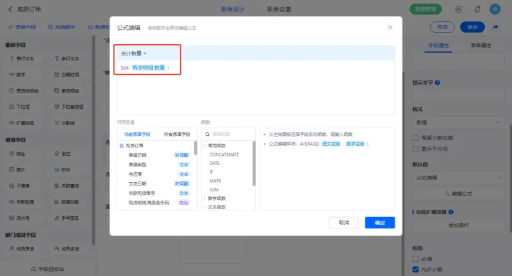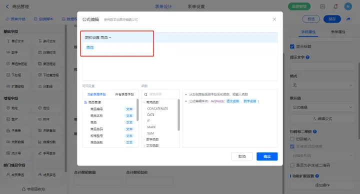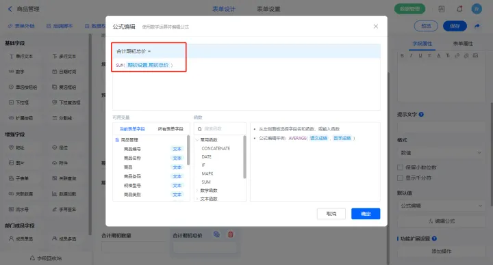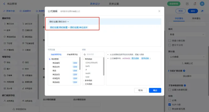 2)【合计期初数量】字段设置默认值为公式编辑,如图设置公式;