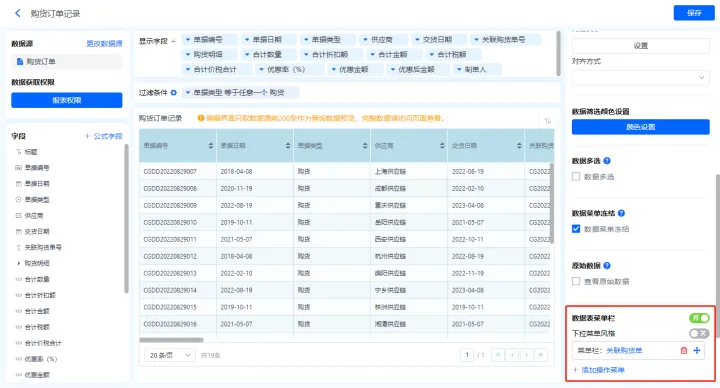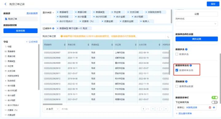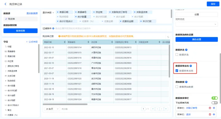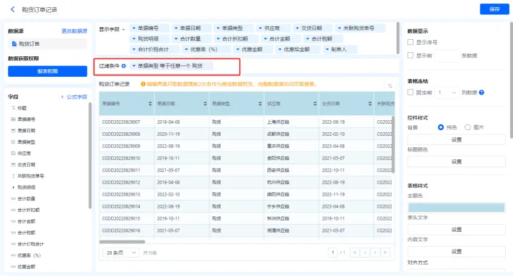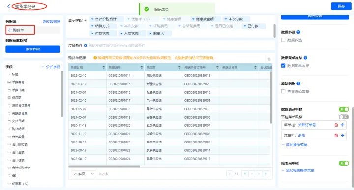 1)新增【历史购货单】报表,用基础报表【数据表】展示数据源为表单【购货单】的数据;