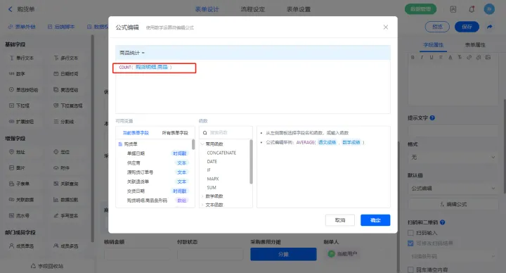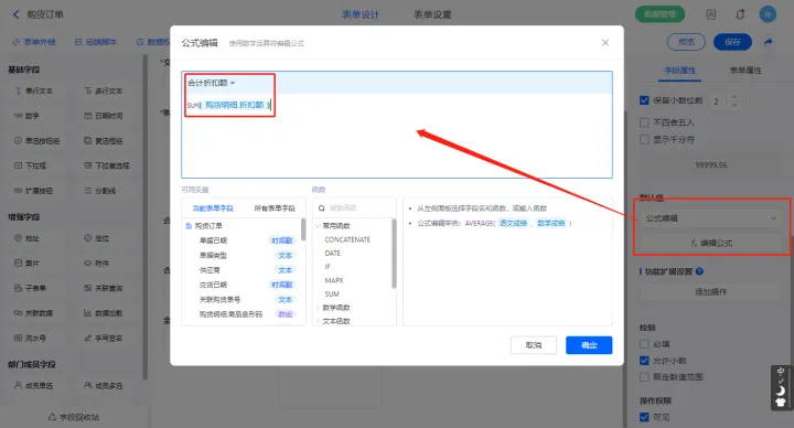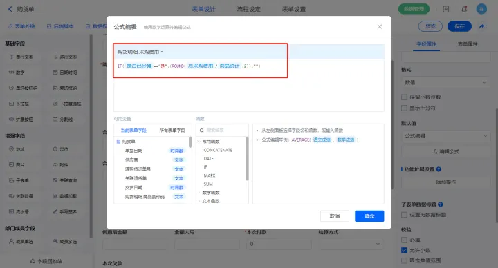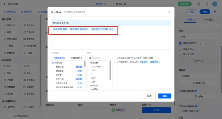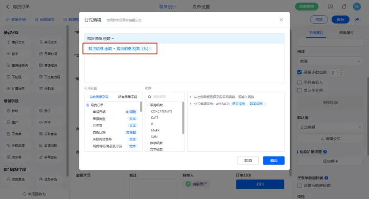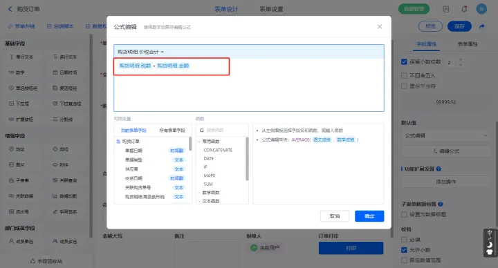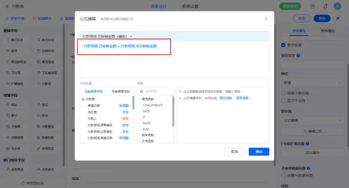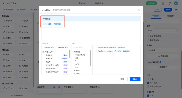 【本次欠款】字段设置默认值为公式编辑,如图设置公式;