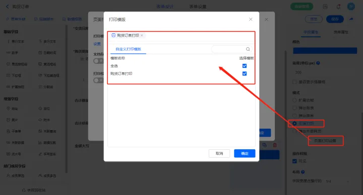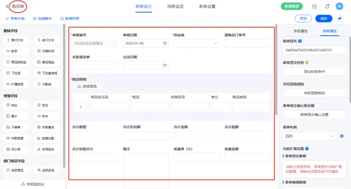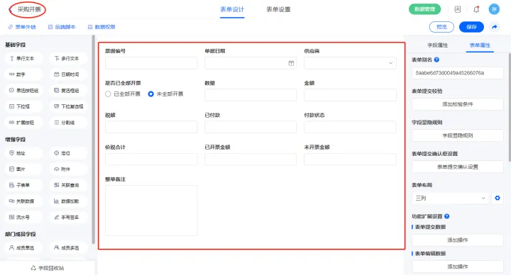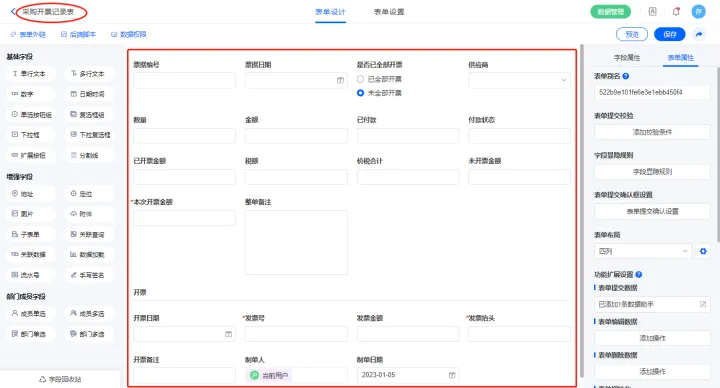 2.10、表单【采购开票记录表】字段及表单属性设置