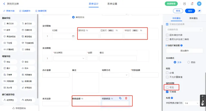 5)【支付明细.付款状态】、【支付明细.已支付(辅助)】、【支付明细.未支付(辅助)】、【核销金额】、【付款状态】以上字段设置为不可见;