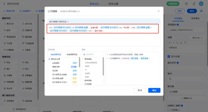 3)【支付明细.付款状态】字段设置默认值为公式编辑,设置公式:“IFS(支付明细.本次支付支付明细.金额,"全部付款",支付明细.本次支付0,"未付款",(AND(支付明细.金额>支付明细.本次支付,支付明细.本次支付!=0)),"部分付款")”;