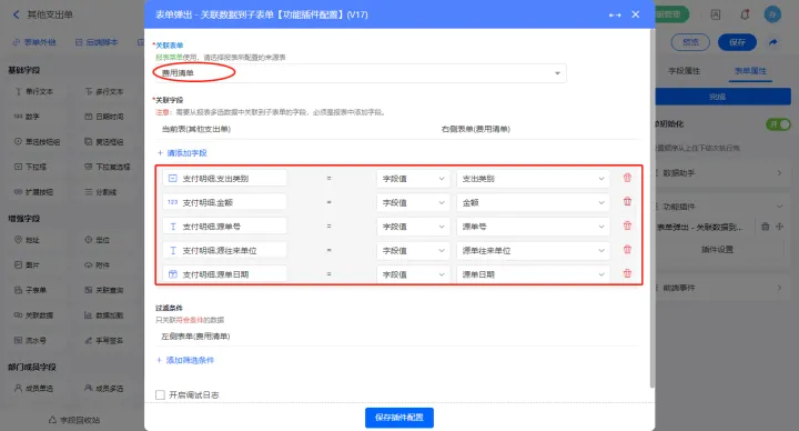 选择关联表单为表单【费用清单】,添加该表的子表单字段对应表单的字段,设置完成点击【保存模块设置】;