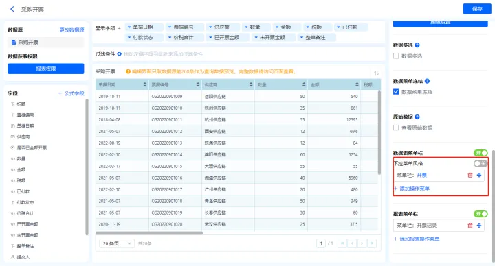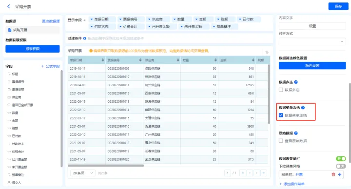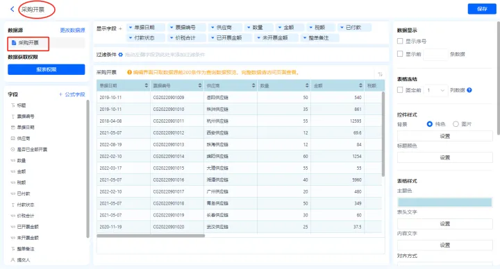 1)新增【采购开票】报表,用基础报表【数据表】展示数据源为表单【采购开票】的数据;