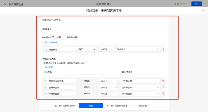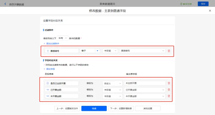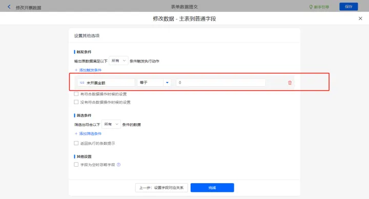 其他设置的触发条件为【未开票金额】等于0,设置好点击【完成】并保存该数据助手;
