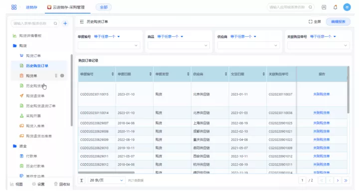 云进销存-采购管理应用支持多种商品特性管理,灵活适配不同主流行业商品管理要求,并可通过报表追溯查询,实现差异化的品类管理及分析。