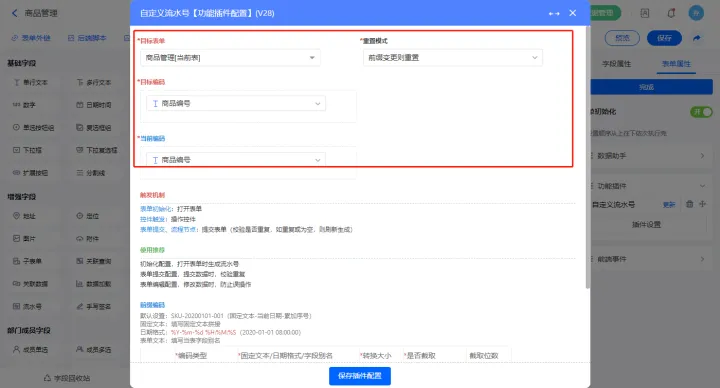 选择目标表为当前表,设置目标编码为【商品编号】字段、编码规则,设置完成点击【保存模块设置】;
