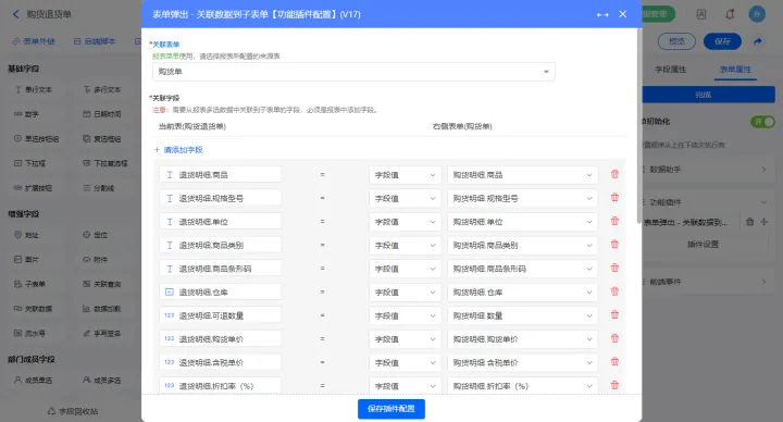 选择关联表单为表单【购货单】,添加该表的子表单字段对应表单的字段,设置完成点击【保存模块设置】;