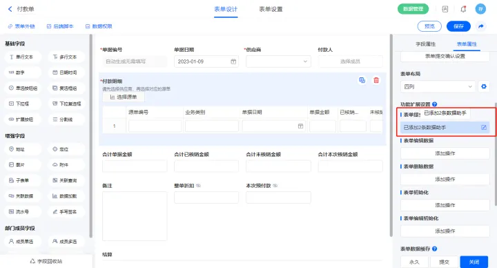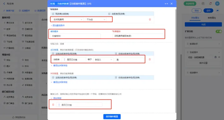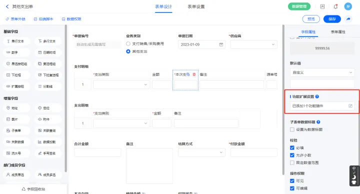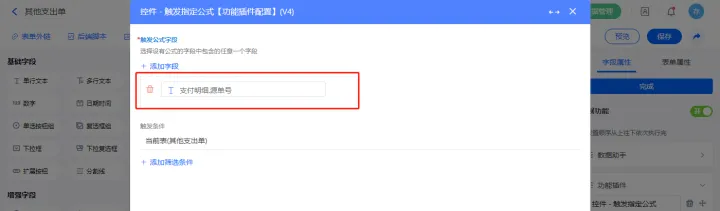 2)【支付明细.本次支付】字段添加功能扩展设置,添加功能插件【控件 - 触发指定公式】;