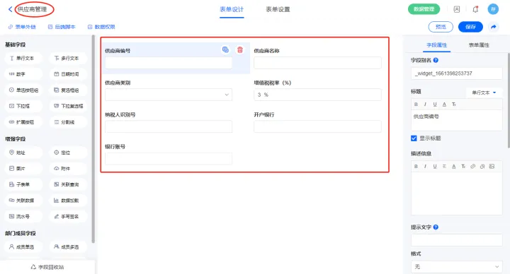 3)新增表单【供应商管理】,字段设置如下;