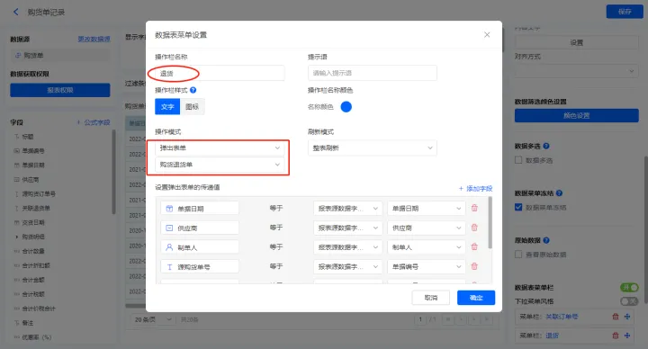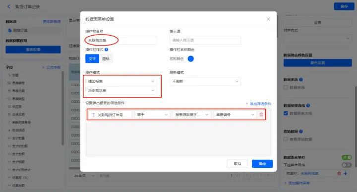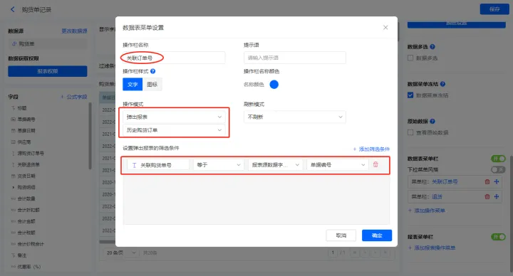 2)新增数据表菜单栏【关联订单号】、【退货】,配置如下;