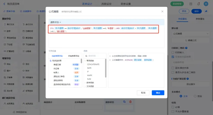 选择【退款状态】字段,设置默认值为公式编辑,设置公式:“IFS(本次退款合计价税合计,"全部退款",本次退款0,"未退款",(AND(合计价税合计>本次退款,本次退款!=0)),"部分退款")”;