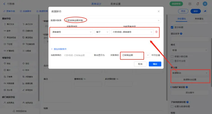 1)选中【付款明细.已核销金额】字段,设置默认值为数据联动,设置联动条件及联动字段;