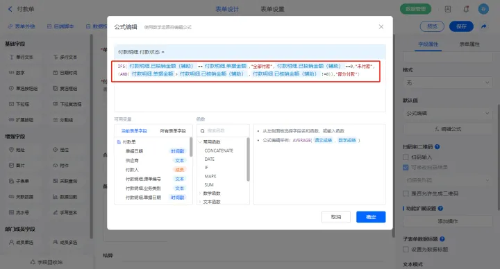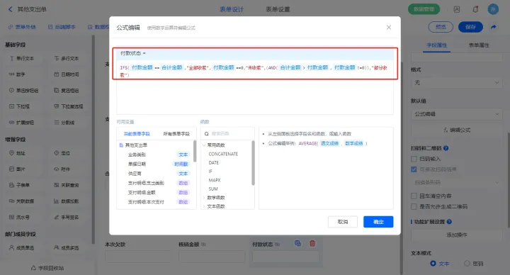 选择【付款明细.付款状态】字段,设置默认值为公式编辑,设置公式:“IFS(付款明细.已核销金额(辅助)付款明细.单据金额,"全部付款",付款明细.已核销金额(辅助)0,"未付款",(AND(付款明细.单据金额>付款明细.已核销金额(辅助),付款明细.已核销金额(辅助)!=0)),"部分付款")”;